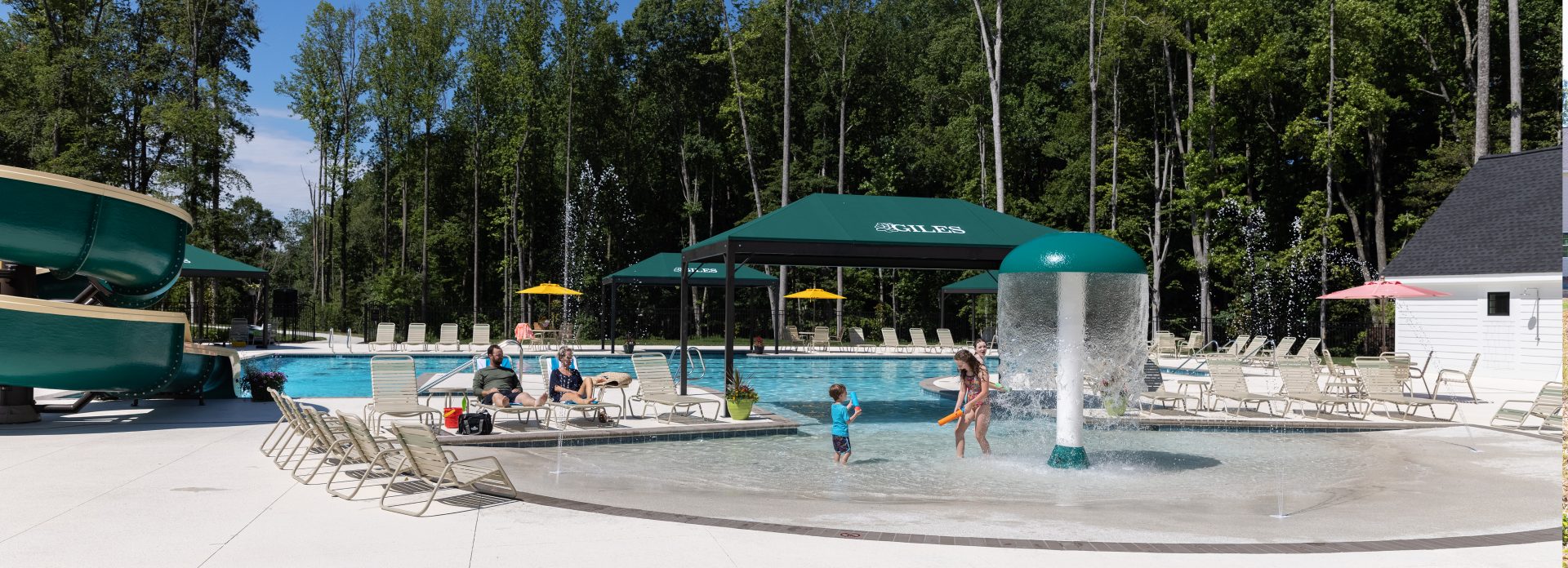 • A resort-style pool including a waterslide, beach-like zero entry, lap lanes, shade structures.